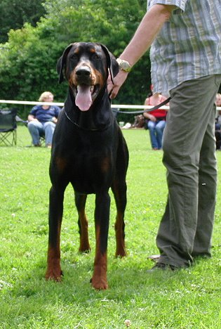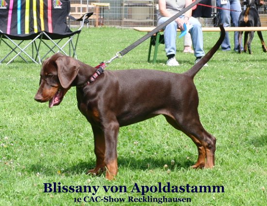 Blissany von Apoldastamm, onze jongste aanwinst van Kayleigh's B-Nest (geb. 2 April 2012) heeft op de CAC-Show van 1 juli in Recklinghausen een 1e uitmuntende beoordeling gekregen van keurmeester Armin Hoppe (D) en heeft haar omschreven als een komplete gebouwde Dobermannpup met stevige poten met juiste hoeking, sterke / diepe voorborst,